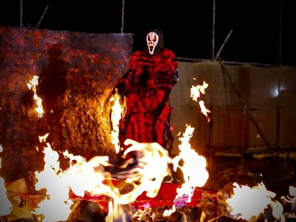 Actors in grotesque costumes moan and writhe amid the fire and smoke, while loudspeakers blast Quranic verses describing punishments for sin and disbelief.